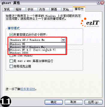 在操作Windows XP中的应用程序时,由于操作不当或者系统本身的问题,导致了操作的程序很长时间没有响应,许多人以为计算机肯定是死机了,于是不少人选择了直接关机或者使用Ctrl+Alt+Delete来重新启动计算机。其实在Windows XP中,有些不能正常运行的程序会引起系统任务栏的假死,这种现象主要是由于当前执行的程序与系统无法兼容引起的。遇到这种现象时,我们可以找到该程序的执行文件,然后单击鼠标右键,选择“属性”,在弹出的对话框中选择兼容性标签(如图11),再在兼容模式下选择相应需要的运行环境。