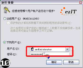安装在Windows XP操作系统中的许多程序,都要求用户具有一定的管理权限才能让用户使用程序,因此为了能够使用好程序,我们有时需要为自己临时分配一个访问程序的管理权限。在分配管理权限时,我们可以先普通用户身份登录到Windows XP的系统中,然后用鼠标右键单击程序安装文件,同时按住键盘上的Shift键,从随后出现的快捷菜单中点击运行方式(如图9),最后在弹出的窗口中输入具有相应管理权限的用户名和密码(如图10)就可以了。