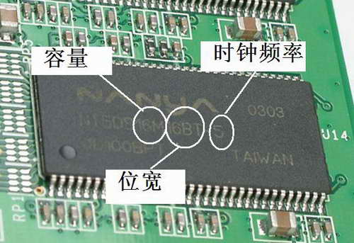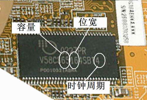 无论TSOP的还是BGA的,上面的同一编码所代表的意义是一样的。对于表示容量的两位代码,64、66表示64MBits(8MB),28=128Mbits,56、57=256Mbits,12=512Mbits,1G=1GBits。接着两位表示位宽的代码意义也不难理解,16表示16位,32就表示32位。表示时钟周期的两位(或一位)代码也很好理解,4表示4ns,5表示5ns,25、28、36分别表示2.5ns、2.8ns和3.6ns,简而言之你看到的数字是一个的话那么时钟周期就是那个,两个的话就在中间加个小数点。