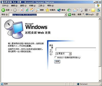 在客户端运行IE浏览器,在地址栏中按 “http://服务器地址(域名)/tsweb”格式键入服务器地址,如服务器地址为218.76.219.5,则可在地址栏中输入“http://218.76.219.5/tsweb/”,回车之后,“远程桌面 Web 连接”的页面将出现在IE窗口中,如图3所示,在网页中的“服务器”栏中键入想要连接的远程计算机的名称,单击“连接”按钮即可连入远程桌面。