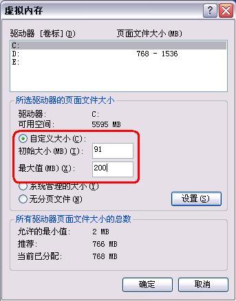 现在回到“虚拟内存”的设置对话框中选择自定义大小并按照上面的计算结果分别设置“初始大小”和“最大值”,如图 11。这里我们将“初始大小”设置为91M,而将“最大值”设置成了200M,这样比较保险。