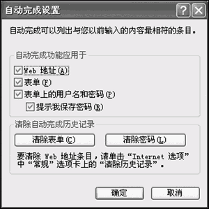 如果选中“表单”复选框,那么当您在网页上输入文本的时候(比如您登录Web邮箱时填写的用户名),IE也会自动把它们记录在册的,下次您输入的时候,也会自动提供可能的信息。对了,您用搜索引擎时输入的关键词它也会记录下来的。
