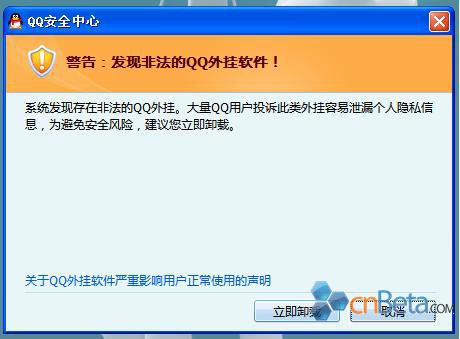 前几天腾讯公司阉割了QQ业务中的千里眼,意在剑指彩虹QQ显示隐身,最近又连番警告用户不要使用任何非法QQ外挂,这些措施都是为了打击彩虹QQ用户。而今天腾讯终于开始下狠手了,只要使用彩虹QQ登录,5分钟之内QQ安全中心就会弹出警告对话框,警告:发现非法的QQ外挂软件,如果不立即卸载掉彩虹外挂,QQ会自动关闭。