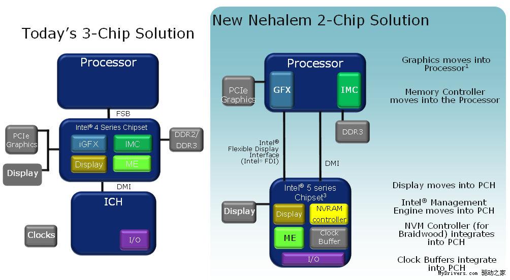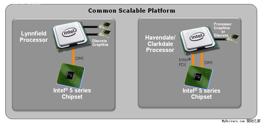 我们知道,Havendale处理器将会集成图形核心,不过只有搭配H57、H55、Q57芯片组并配合弹性显示界面(FDI)才能启用,P57、P55不支持。