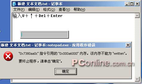 打开任意一个应用程序,如记事本或者一个程序对话框等(不管是否存在文本输入框均可),点击系统托盘上的输入法图标切换到“智能ABC”,或者按“Ctrl+Shift”切换到“智能ABC”,依次按这些键:“V+↑+Del+Enter”(引号和加号不要输入),此时就会发现当前焦点的应用程序出错了,只能点击“确定”这个惟一的选择按钮,然后这个应用程序就关闭了!某些情况下错误报告对话框可能会出现多次,用户也只有一再点击“确定”直到关闭这个应用程序。