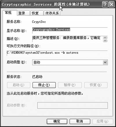 依次单击“开始→设置→控制面板→管理工具→服务”,在“服务”窗口的右侧找到“Cryptographic Services”选项,双击它打开“属性”窗口,将其“启动类型”设置为“自动”(如图所示)。需要注意的是,“Cryptographic Services”依赖“Remote Procedure Call (RPC) service”,如果你的RPC服务没有被启用该服务,那么你可以启用它。如果在“服务”窗口中无法启用,可以使用Windows XP安装光盘启动电脑,进入“故障恢复控制台”,输入命令“Enable RPCSS Service_Auto_Start”启用RPC服务。