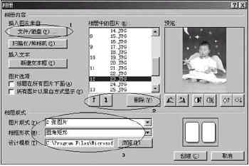 3. 所有被选择插入的图片文件都出现在相册对话框的“相册中的图片”文件列表中,单击图片名称可在预览框中看到相应的效果。单击图片文件列表下方的“↑”、“↓”按钮可改变图片出现的先后顺序,单击[删除]按钮可删除被加入的图片文件。