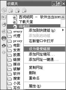 上网久了,收藏夹中的记录变得越来越长,有时候由于来不及整理,收藏记录就变得既零乱又庞杂,常常为了打开其中某个网页的链接而在收藏夹中寻寻觅觅,甚至还要不断翻阅当中的文件夹才能找到,既麻烦又费时。MyIE2的收藏夹功能中有一个叫做“最爱链接”的功能,使用者把有关的网址设为最爱链接后,该链接名称便会用醒目的红色表示出来。如此一来,使用者就可以在收藏夹里快速寻找到这些重要链接了,而且通过“打开本层最爱链接”能够一次性打开某层收藏夹目录里的所有最爱链接,使用起来非常方便,有关设置如下:打开菜单“收藏夹→组织收藏夹”命令(或直接点击工具栏上的收藏夹图标),用鼠标右击某个链接,在弹出的菜单中选择“设为最爱链接”(如图1),此时在链接的名称前面会出现一朵小红花,在收藏夹菜单下该链接的名称则全部变为红色,相当醒目。要取消最爱链接,可以再次右击链接,然后选择“取消最爱链接”即可。