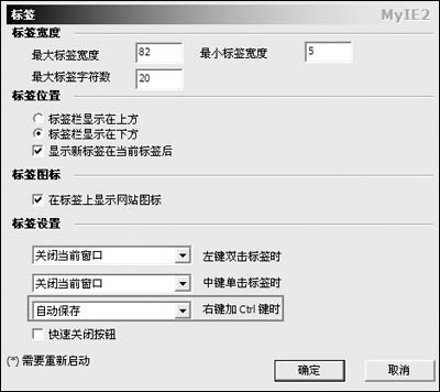 第一步,依次打开“选项→MyIE2选项→标签”窗口,在“标签设置”可看到当鼠标双击、中键单击、Ctrl+右键点击网页标签时可以各自执行不同的动作。把其中一种鼠标点击行为设为“自动保存”,在此建议选择Ctrl+右键点击方式(如图4)。