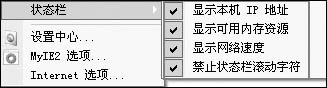 一直以来,不少网友都抱怨上网后不能及时掌握系统资源的变动情况(例如上网后的IP地址、剩余内存、当前网速等),从而更好地有的放矢。现在,在MyIE2的状态栏上可以即时获得这些信息:打开菜单“选项→状态栏”后把全部可选项都勾选了(如图2),相关信息就能一览无遗。除了这些信息以外,你还可以通过状态栏上的图标很方便地进行设置广告过滤、脱机浏览、启用/禁用过滤、开启简易收集板等操作(如图3)。