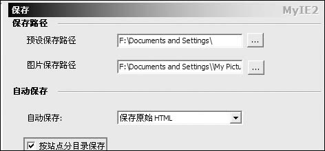 第二步,同样在“MyIE2选项→保存”窗口,分别设置图片和网页文件的保存路径并设置自动保存的文件类型。建议选择“按站点分目录保存”(如图5),这样日后查找起来比较方便些。
