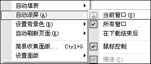 对于一些长长的网页文本,阅读时就只要不断向下翻页,总是让人觉得不太方便。如果你喜欢在网上阅读长篇小说,“自动滚屏”功能就一定助你一臂之力:首先在菜单“工具→自动滚屏”选择对“当前窗口”还是“全部窗口”执行操作,再从三种(高速、中速、低速)不同的速度控制方式中选择一种,勾选“鼠标控制”(如图6)。完成后只要鼠标指向窗口右侧的滚动栏上就能实现自动滚屏(由鼠标的位置决定滚动方向和速度.越靠下则滚动速度越快,反之,越往上则滚动速度越慢),当鼠标离开滚动条则停止滚动。