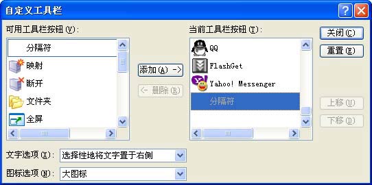 自已可以对工具栏进行设置,操作如下;单击“查看”菜单,选择“工具”,选择“自定义”,弹出“自定义工具栏”对话框(如图4),在“可用工具栏按钮”中选择要增加的工具按钮,单击“添加”按钮可以添加到“当前工具栏按钮”中,在“文字选项”下拉列表中可以指定是否在工具栏上显示工具按钮的文字说明以及文字显示的位置,“显示文字标签”是在工具栏上的每个按钮下面显示按钮的名称,“无文字标签”是在工具栏上显示图标。在“图标”下拉列表中可以设置图标的大小。再将鼠标移到工具栏首竖线右侧按住左键,此时鼠标箭头变成带箭头的十字光标,现在就可以将工具栏移到其它位置。