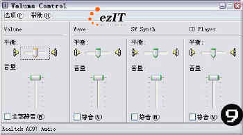 对于计算机上播放的声音或者由多媒体应用程序播放的声音,使用“音量控制”可以调节其音量、均衡、低音或高音设置。也可以使用“音量控制”调整系统声音、麦克风、CD音频、线路输入、合成器以及Wave输出的音量。(见下图)