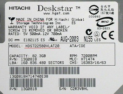 H Hitachi(日立) D Deskstar系列 S Standard标准(相对的还有A,表示自动) 72 7200转 25 最大容量250GB 80 型号容量80GB V 代码 L 1 inch form factor AT ATA(SA则表示SATA) 2 2MB缓存(8代表8MB) 0 保留