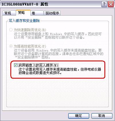 在“我的电脑”上单击鼠标右键选择“属性->硬件”,打开设备管理器找到当前正在使用的硬盘,单击鼠标右键选择属性。在硬盘属性的的“策略”页中,打开“启用磁盘上的写入缓存”,如图 1。