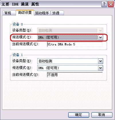在设备管理其中选择IDE ATA/ATAPI控制器中的“基本/次要IDE控制器”,单击鼠标右键选择“属性”,打开“高级设置”页。这里最重要的设置项目就是“传输模式”,一般应当选择“DMA(若可用)”,如图 2。