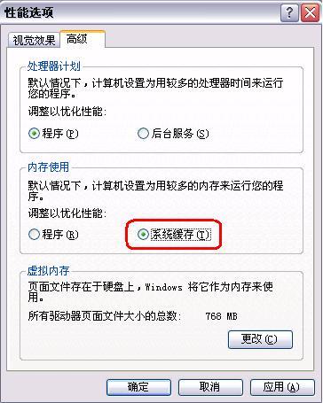 在“我的电脑”上单击鼠标右键,选择“属性->高级”,在“性能”下面单击“设置”按钮,在“性能选项”中选择“高级”页。这里有一个“内存使用”选项,如果将其设置为“系统缓存”,Windows XP 将使用约4MB的物理内存作为读写硬盘的缓存,这样就可以大大提高物理内存和虚拟内存之间的数据交换速度。默认情况下,这个选项是关闭的,如果计算机的物理内存比较充足,比如256M或者更多,最好打开这个选项。但是如果物理内存比较紧张,还是应当保留默认的选项,如图 3。