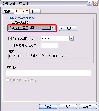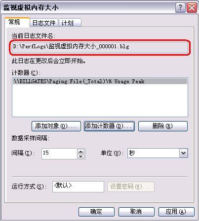 五、别忘了记住“日志文件”页中的日志文件存放位置和文件名,我们后面需要查看这个日志来判断Windows XP平常到底用了多少虚拟内存,在这个例子中,日志文件被存放在D:\Perflog目录下,如图 8。
