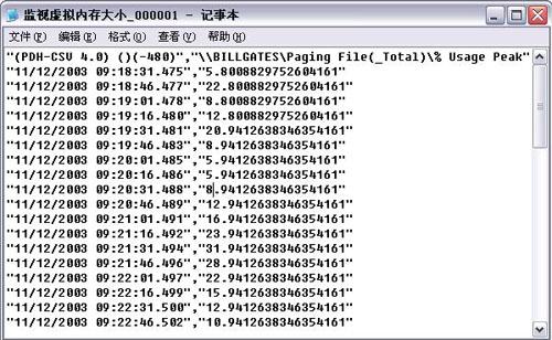 这个日志文件记录这一段时间中页面文件的使用情况,注意这里的单位是%,而不是MB。通过简单的计算,我们就可以得到页面文件的最小尺寸,公式是“页面文件尺寸X百分比”。比如这个例子中,虚拟内存最大的使用比率是31%,300MBX31%=93MB,这个值就是虚拟内存的最小值(注意,300MB是前面的设置的临时值)。
