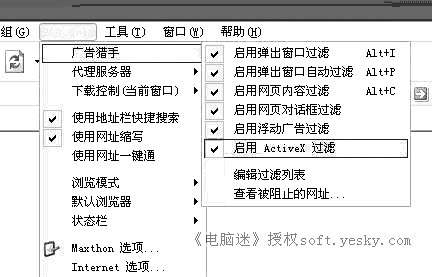 打开Maxthon浏览器,点击“选项/广告猎手”,勾选 “启用Active X过滤”选项(如图2),再次浏览时,Maxthon就可以拦截Active插件了。