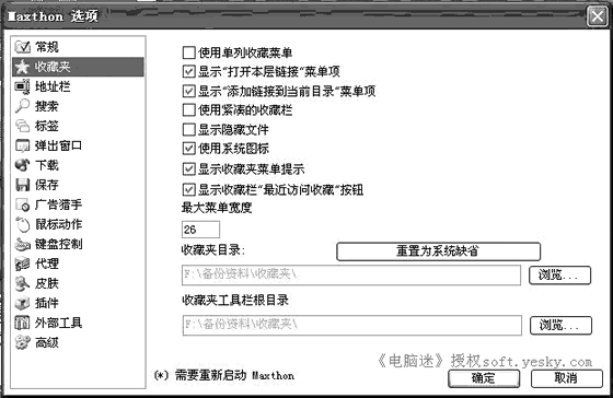 打开Maxthon选项,点击“收藏夹”子项(如图4),点击收藏夹根目录后的“浏览”按钮,将收藏夹的工作目录指定到非系统分区中。即使系统分区格式化了,在Maxthon中指定收藏夹工作目录到以前的目录,即可找回收藏夹里的内容。
