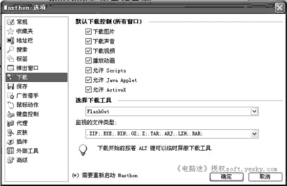 打开Maxthon选项,点击“下载”子项(如图6),选择默认的下载工具及监视的下载文件类型,以后再下载这类文件时,浏览器就会选择默认的下载工具来下载了。