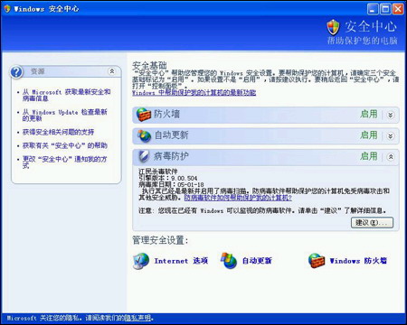 当然在这其中还是以“木马病毒”最令人头痛,而在XP SP2中自带的安全总管便可以帮您解决这一难题。由于大多数用户不知道自己的系统是否处于安全状态,这给病毒或黑客的入侵留下了可乘之机。Windows 安全中心能够监视系统安全组件是否正常工作,通过它可以在最短的时间内识别出Windows防火墙、自动更新、防病毒软是否已经正常工作。